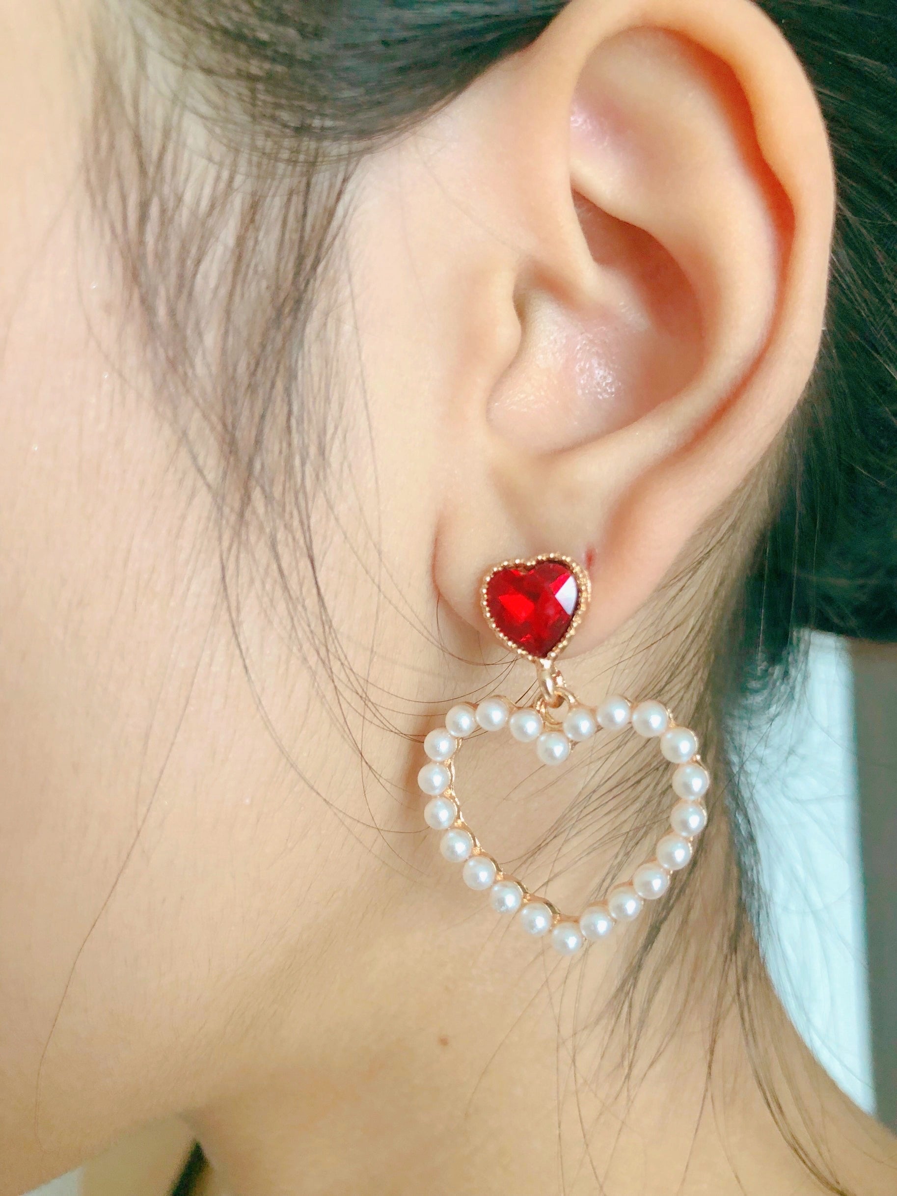 Aretes corazón rojo y perlas